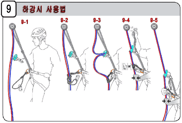 9-5. 한손으로 하가용백업장치를 다른한손으로 하강로프를 감어쥐고 하강을 시작합니다.