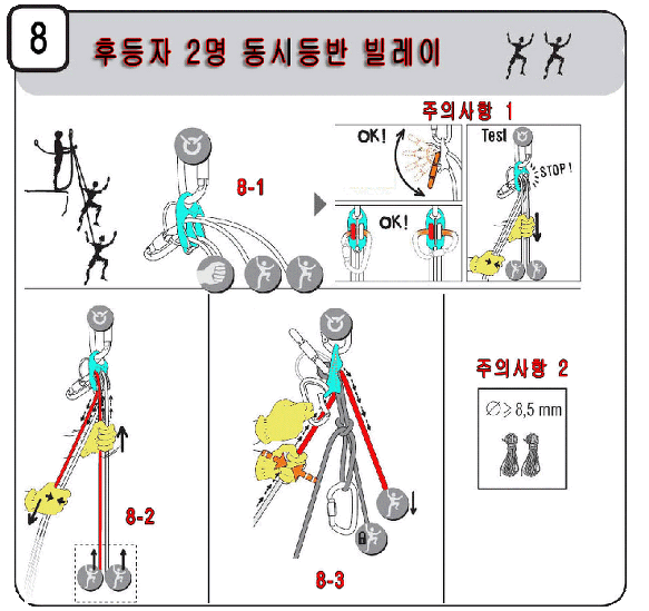 주의사항 : 사용하는 잠금형카라비너는 페츨사의 윌리엄스 같이 직선부분이 장비의 좁은쪽 부분보다 넓은것을 사용하기를 권장. 이유는 제동시에 두가닥의 로프에 동일한 힘이 전달되기 위함입니다.