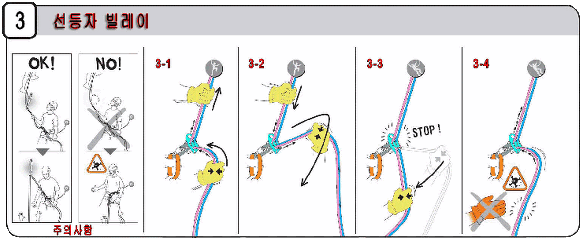 주의사항 : 릴리즈용 카라비너를 너무 확 잡아당기면 제동력이 갑자기 줄어들어 등반자가 많은