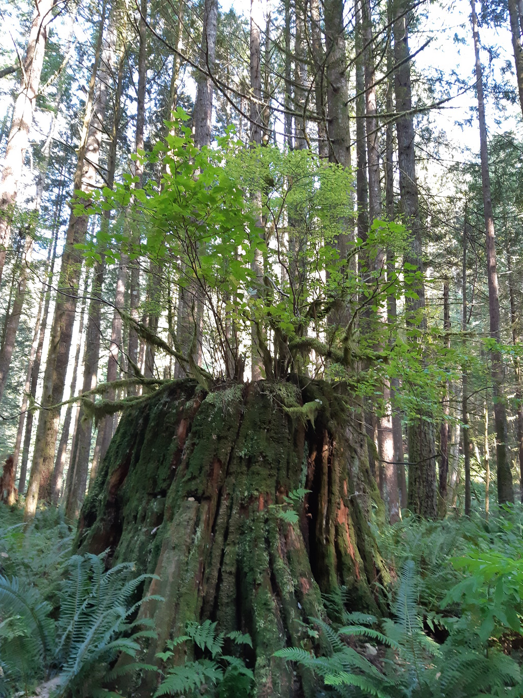 그루터기 윗면에 흙도 쌓이고 나뭇잎도 쌓여 같이 썩어가는 과정에서
