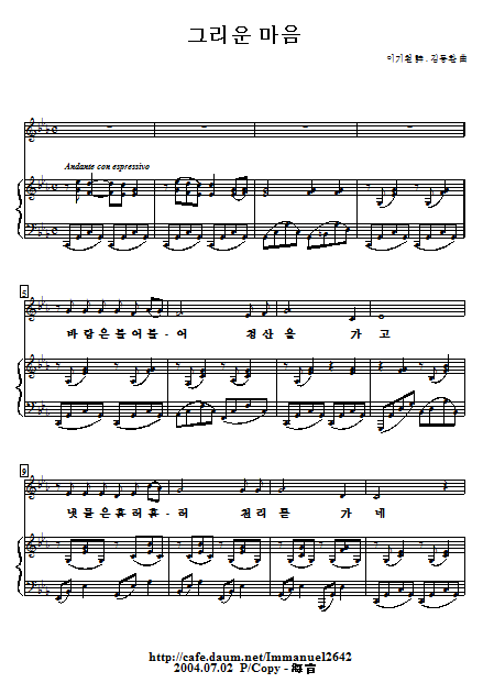 그리운 마음(이기철시, 김동환곡) 작성자이상민|작성시간19.02.11|조회수1,850 목록 댓글 2 글자크기 작게가 글자크기 크게가 바리톤 조덕수 연주곡입니다. 그리운 마음(이기철 詩 . 김동환 曲)-3b.nwc 첨부파일첨부된 파일이 4개 있습니다. c 파일 그리운 마음(이기철 詩 . 김동환 曲)-3b.nwc 다운로드 etc 파일 그리운 마음-1.PNG 다운로드 etc 파일 그리운 마음-2.PNG 다운로드 etc 파일 그리운 마음-3.PNG 다운로드 다음검색 현재 게시글 추가 기능 열기 북마크 신고 센터로 신고 댓글 댓글 2 댓글쓰기 답글쓰기 댓글 리스트 작성자황덕식 | 작성시간 19.02.11 잘 안열려서.. b3개 인가요..?그리고 연주 당일은 2시부터 리허설, 4시 연주, 6시 석식, 7시부터 뒷풀이가 있습니다 답댓글 작성자이상민 작성자 본인 여부 작성자 | 작성시간 19.02.11 b3개 입니다. 나중에 pdf 파일로 다시 올리겠습니다. 댓글 전체보기