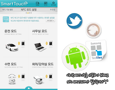 메뉴를 보시면 아시다시피 NFC태그를 이용한 기능은 꽤나 다양한데요, 취침모드, 오피스모드, 자동차 모드 등등 장소에 따라 원하는 모드로 태그 한번 접촉만으로 바로 변경이 가능합니다. 예를 들어 자동차에 부착해둔 태그에 스마트폰을 접촉시키면 블루투스 기능이 자동으로 ON-GPS ON-볼륨크기 설정-T맵 자동실행까지~! 본인이 설정한대로 휴대폰 설정이 변경됩니다. 그리고 차에서 내릴 때도 태그에 접촉함으로써 다시 원래대로 돌아오죠. 이런 모드설정 뿐만 아니라 Tag 스티커에는 간단한 텍스트를 입력해 두거나 웹브라우져 URL을 등록 할 수도 있고, 주소록을 저장할 수도 있습니다.