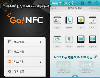 또한 휴대폰 제조사에 따라 폰을 구매할 때 기본적으로 NFC태그스티커를 제공하기도 하는데요. 이 태그 스티커가 있다면 자신이 원하는대로 설정하여 NFC기능을 이용하실 수 있습니다. NFC기능이 탑재되어있는 스마트폰에는 이 기능을 사용할 수 있게끔 기본적으로 NFC관련앱이 내장되어 있는데요, SKT의 경우 SK플래닛에서 개발한 스마트 터치앱으로 NFC기능을 좀더 효율적으로 관리할 수 있습니다. 젤리빈OS 이전 버전의 스마트폰에는 'Go NFC'란 이름의 앱이 존재하는데, 기능이 더 추가된 '스마트터치'로 업그레이드하여 사용하실 수 있습니다. 스마트 터치는 T스토어, 구글 플레이에서 통신사에 관계없이 바로 이용하실 수 있습니다.