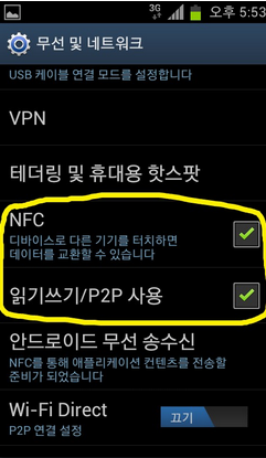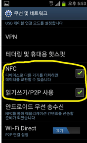 무선 및 네트워크에서 NFC를 찾아서 ON합니다. 그리고 꼭 "읽기쓰기/P2P 사용" 을 켜놓아야합니다.