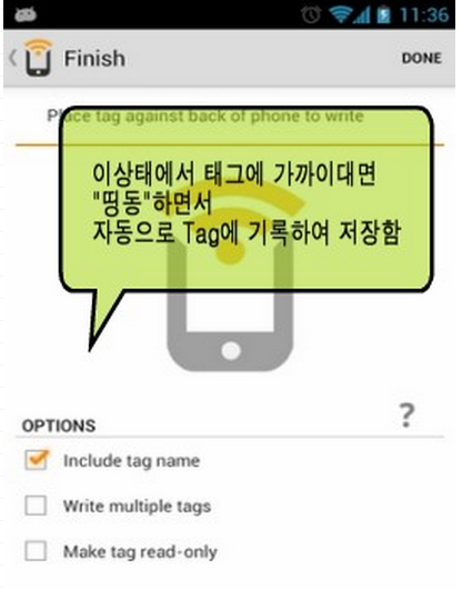 ④ 사용법은 아래 그림 참고.(아래그림은 쓰기(기록)만 나와있네요. 그후에는 폰만 가까이대면 자동으로 읽습니다^^)