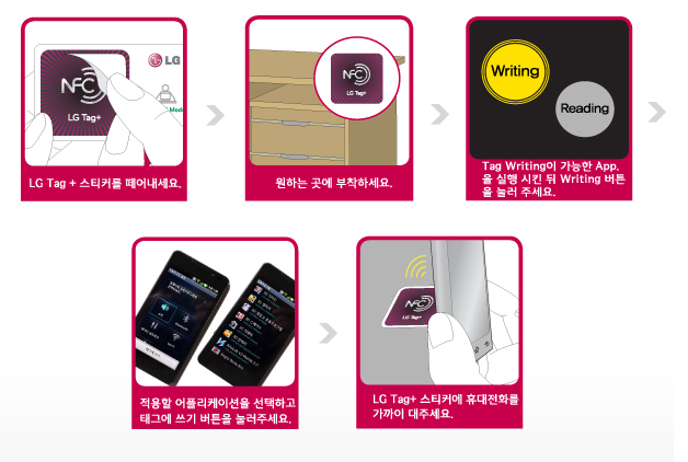 "NFC TAG(일종의 전자태그라고 보시면됨)에 폰을 가까이대면 TAG에 기록된 정보를 읽거나 명령을 수행한다"