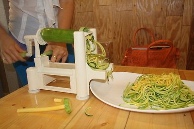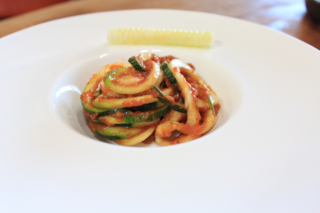 김 대표는 씻은 애호박을 통으로 조리기구에 꽂더니 손잡이를 돌렸다. 그러자 애호박이 돌려 깎이기 시작했다. 껍질을 까는 기계처럼 보이는 조리기구가 애호박 하나를 금방 면으로 바꿔놓았다. 60㎝ 이상 되는 면으로 만들어졌다. 김 대표는 그릇에 애호박 면을 담고 토마토소스를 내놓았다. 토마토소스도 열을 가하지 않고 토마토 가루와 파, 마늘 등의 생 양념을 가미해 만들었다. 소스의 첫 느낌은 김치 양념 같았다. 열을 가하지 않았으니 마늘과 파의 강한 향이 그대로 있었기 때문이다. 하지만 먹어보니 토마토의 진한 맛이 느껴졌다.