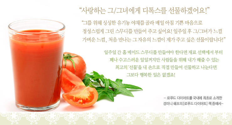 “원푸드 다이어트나 단식으로 살을 뺀 사람이 요요현상에 시달리는 이유는 근본적인 식습관을 고치지 못했기 때문이에요. 다이어트는 맛있게 먹고 꾸준히 할 수 있는 식습관 개선이 우선돼야 합니다. 아침에 그린스무디를 마시고 점심과 저녁에 샐러드와 생채반찬을 먹는 것만으로도 50% 이상 로푸드 다이어트를 실천하는 셈입니다. 중요한 것은 평소의 식단에서 가공식품, 패스트푸드, 육류를 하나씩 빼면서 몸에서 일어나는 즐거운 변화를 느껴 자연스럽게 건강한 생활습관을 만드는 것입니다.”