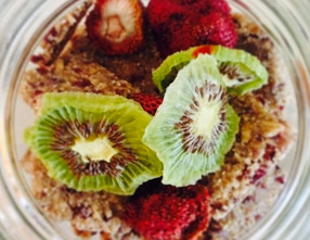 사과 1개, 건포도 또는 건 크랜베리 1 테이블스푼, 아몬드 ½컵, 해바라기씨 1 테이블스푼, 메밀 1테이블 스푼, 치아씨 1 테이블스푼, 시나몬 파우더 1티스푼, 꿀 1티스푼, 곶감 2개, 좋아하는 과일(딸기, 키위 등), 소금 조금