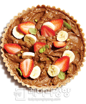 크러스트(곶감 1개, 아몬드·코코넛파우더 3/4컵씩, 천일염 약간), 필링(아보카도 1개, 아가베넥타 3큰술, 캐롭파우더·코코넛파우더 2큰술씩, 바닐라파우더 2작은술, 시나몬파우더·천일염 약간), 토핑용 딸기·바나나·체리·민트 약간씩●Method1 아몬드는 물에 8시간 정도 불려 믹서에 코코넛파우더와 함께 넣고 어느 정도 갈리면 나머지 크러스트 재료를 모두 넣은 다음 반죽이 적당히 뭉쳐질 정도로 간다. 2 타르트 팬에 ①의 반죽을 넣고 꾹꾹 눌러 붙여가며 크러스트를 만든다. 3 아보카도는 반 갈라 껍질과 씨를 제거하고 나머지 필링 재료와 함께 믹서에 넣고 걸쭉하게 갈아 필링을 만든다. 4 ②의 크러스트 위에 ③의 필링을 붓고 스패출러로 펴 바른 뒤 토핑용 과일을 얹는다. 5 완성된 ④의 타르트는 냉장고에 보관하고 먹기 1시간 전에 꺼낸다.