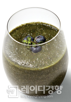 시금치 한 줌, 로메인 5장, 딸기 3개, 바나나 1개, 블루베리·물 1/2컵씩●Method1 시금치와 로메인은 뿌리를 썰어내고 흐르는 물에 깨끗이 씻은 뒤 물기를 제거한 다음 한 입 크기로 썬다. 2 딸기와 블루베리는 물에 잠깐 담가두었다가 흐르는 물에 깨끗이 씻고 딸기는 꼭지를 제거한 뒤 반으로 썬다. 3 바나나는 껍질을 벗기고 한 입 크기로 썬다. 4 믹서에 분량의 물을 붓고 ②의 딸기와 블루베리-③의 바나나-①의 로메인 -시금치 순으로 넣고 간다.