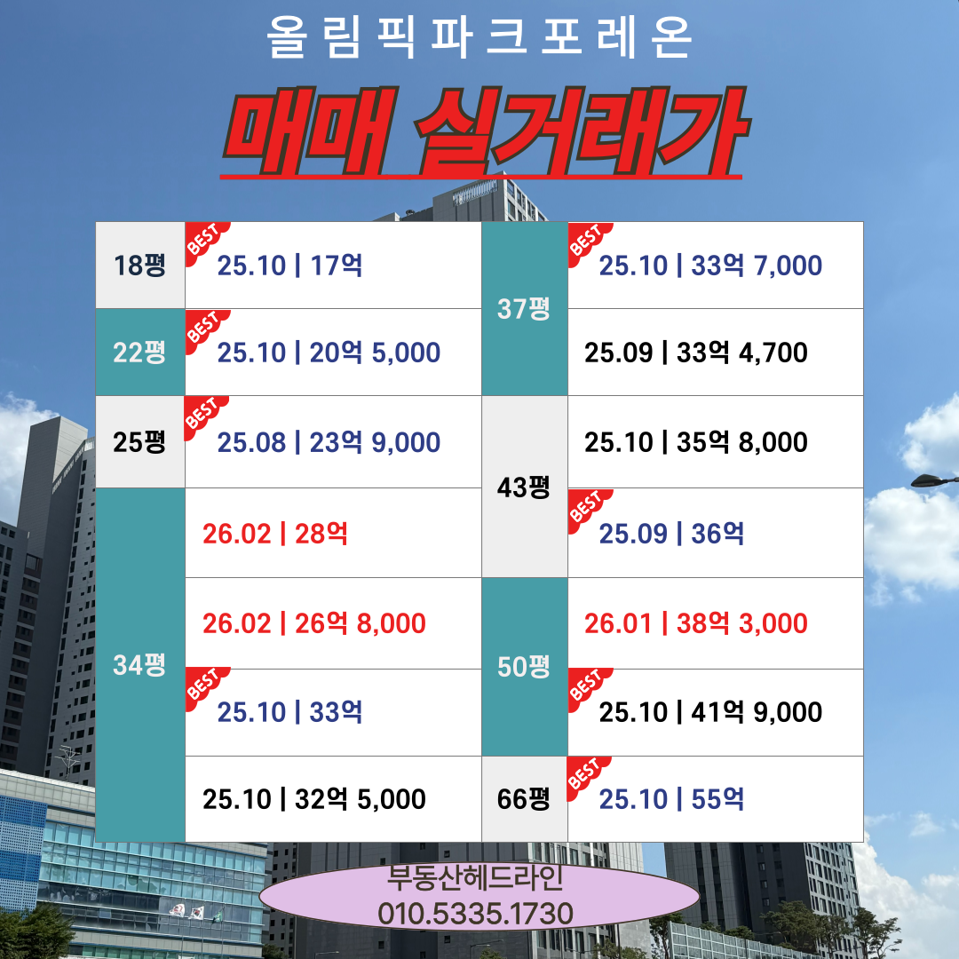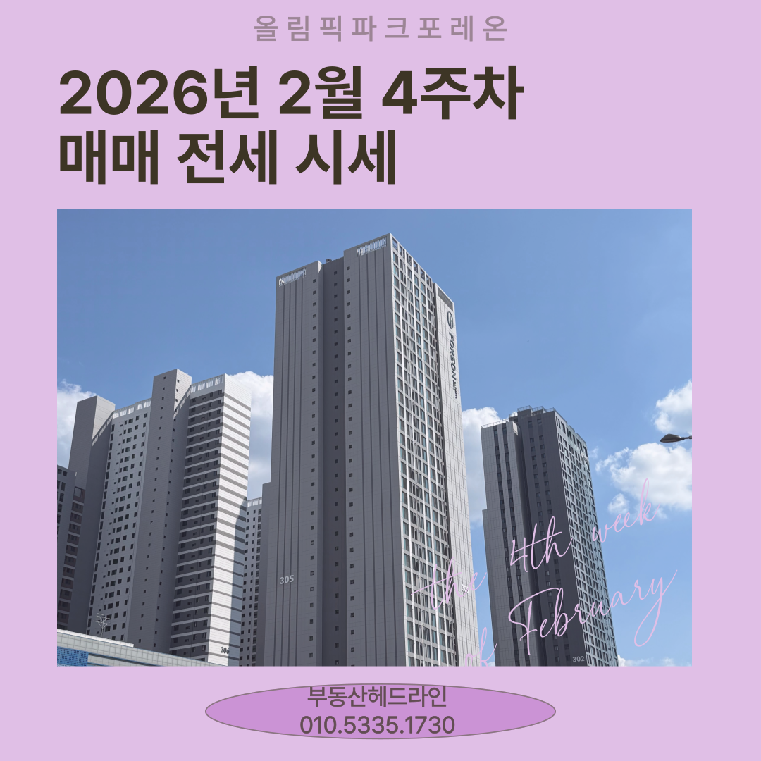 올림픽파크 포레온 2026년 2월 4주차 간략한 매매·전월세 시세 안내입니다.