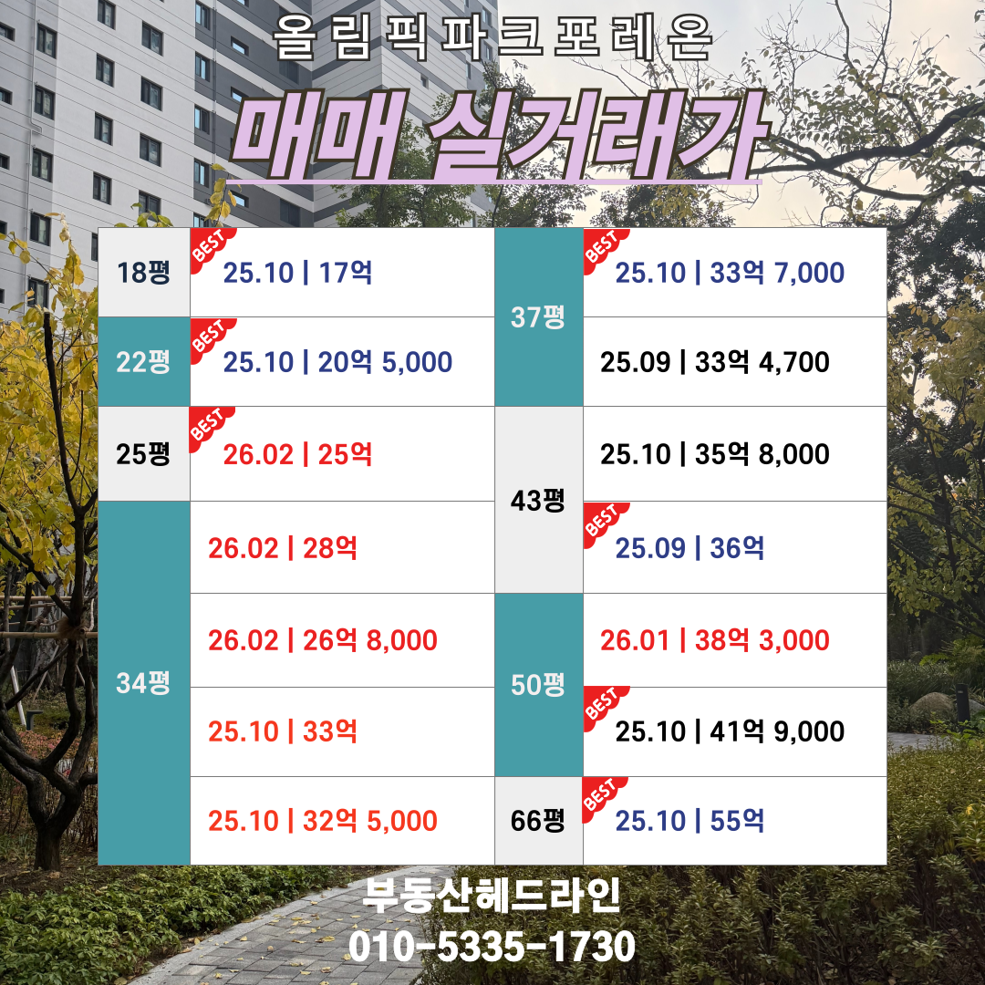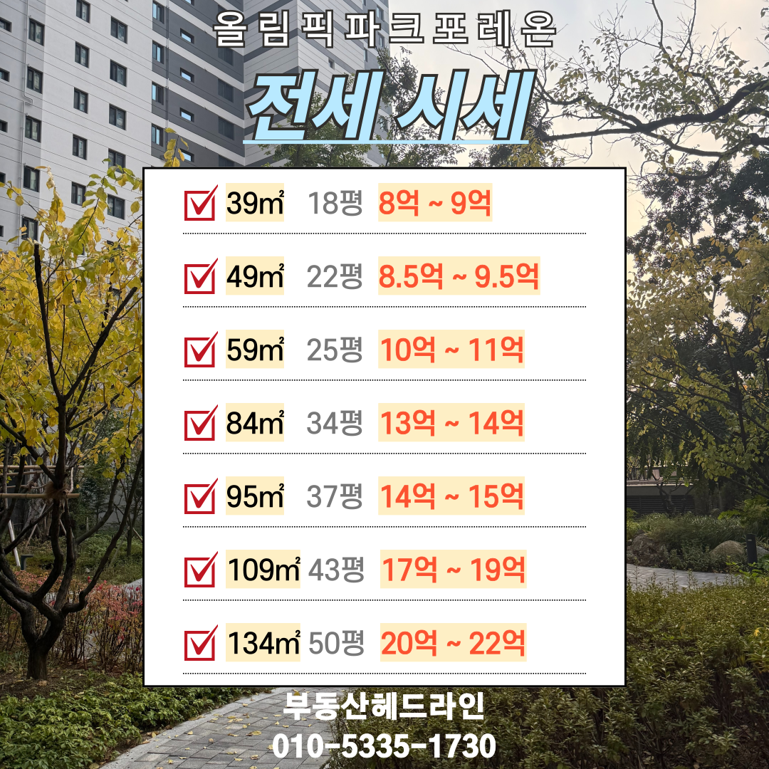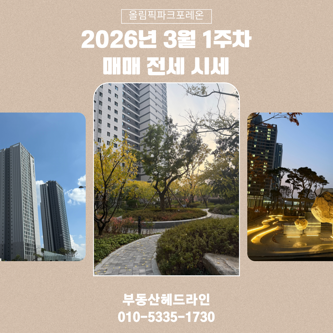 올림픽파크 포레온 2026년 3월 1주차 간략한 매매·전월세 시세 안내입니다.