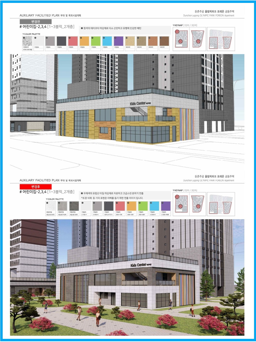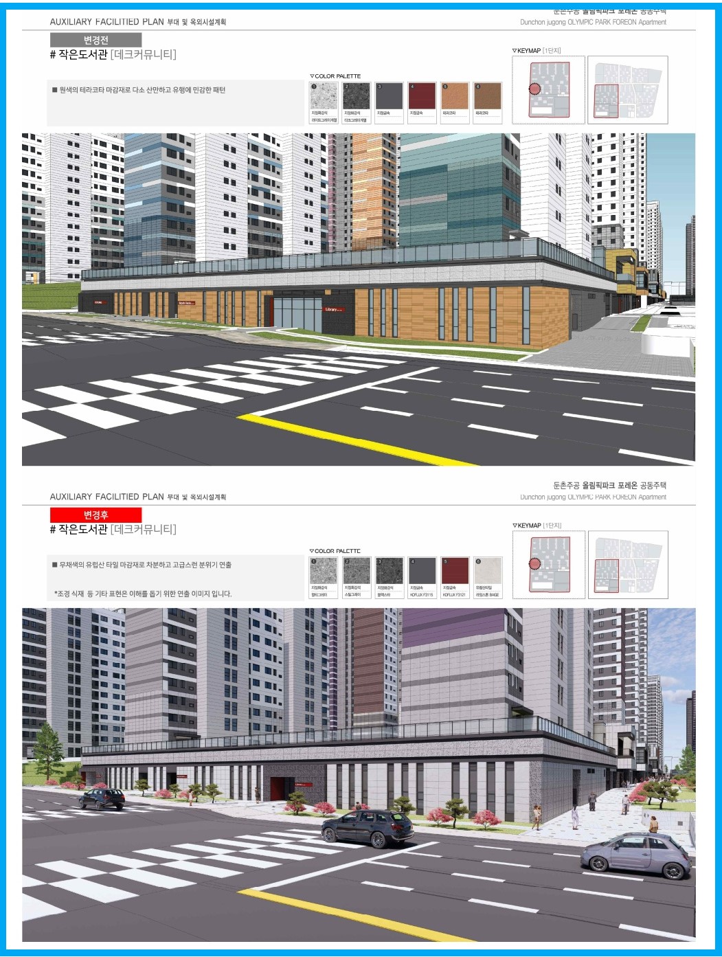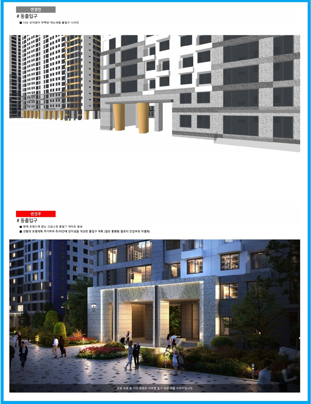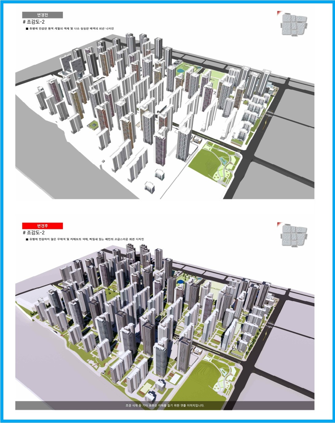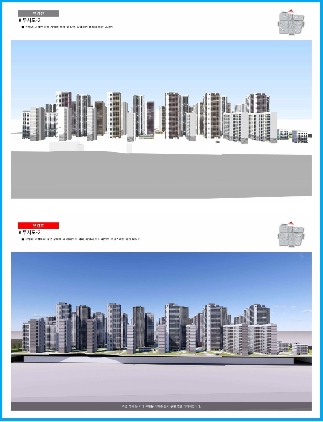 ▶ 안건 제안 내용 : 조합은 단지의 가치 상승을 위한 제안을 시공사업단에게 요청한 바 있으며 시공사업단에서는 서울시 공공건축가와의 협의를 거쳐 단지의 외관 디자인 등을 시공사 부담으로 변경 시공할 것을 제안 하였습니다.