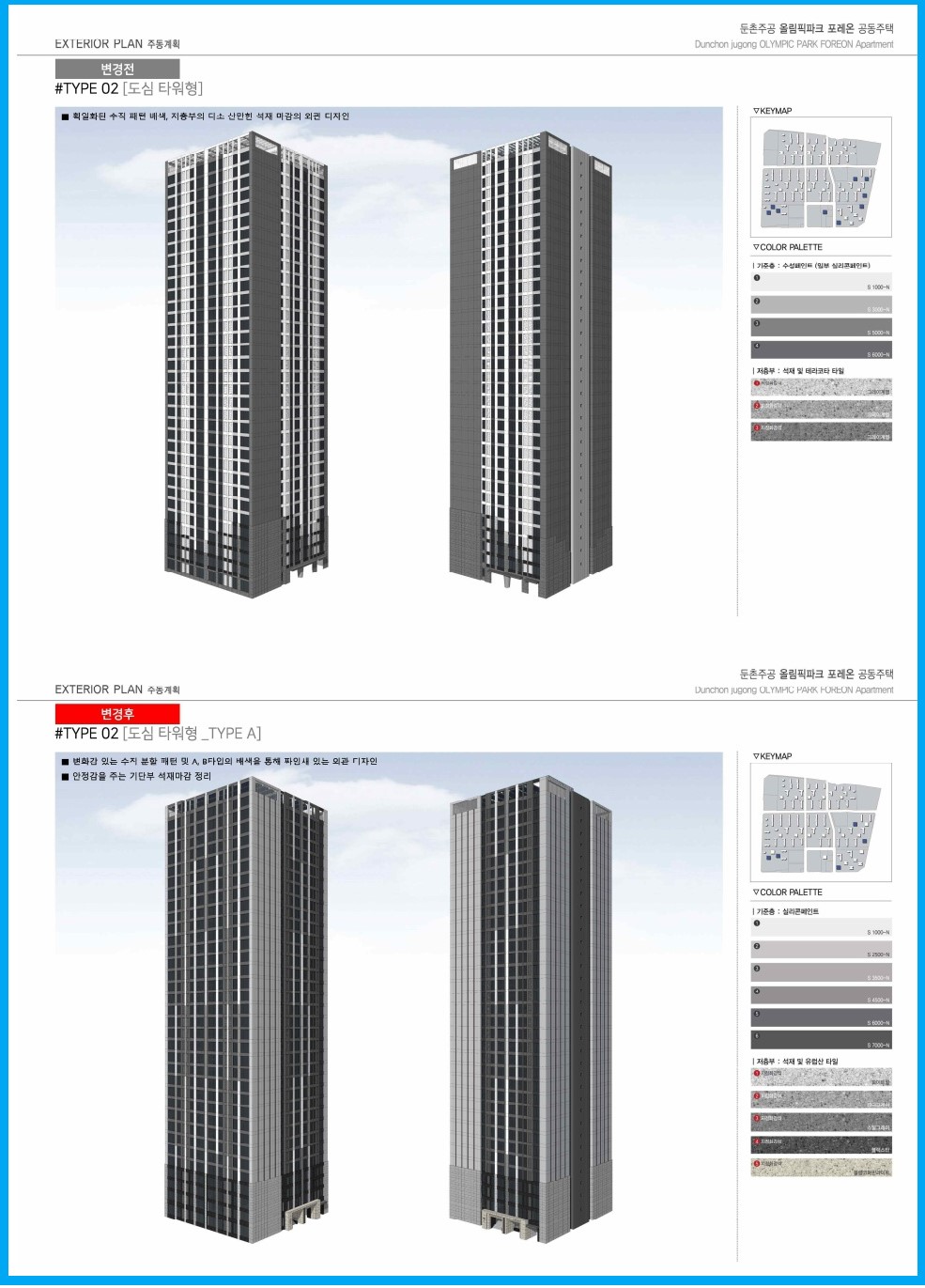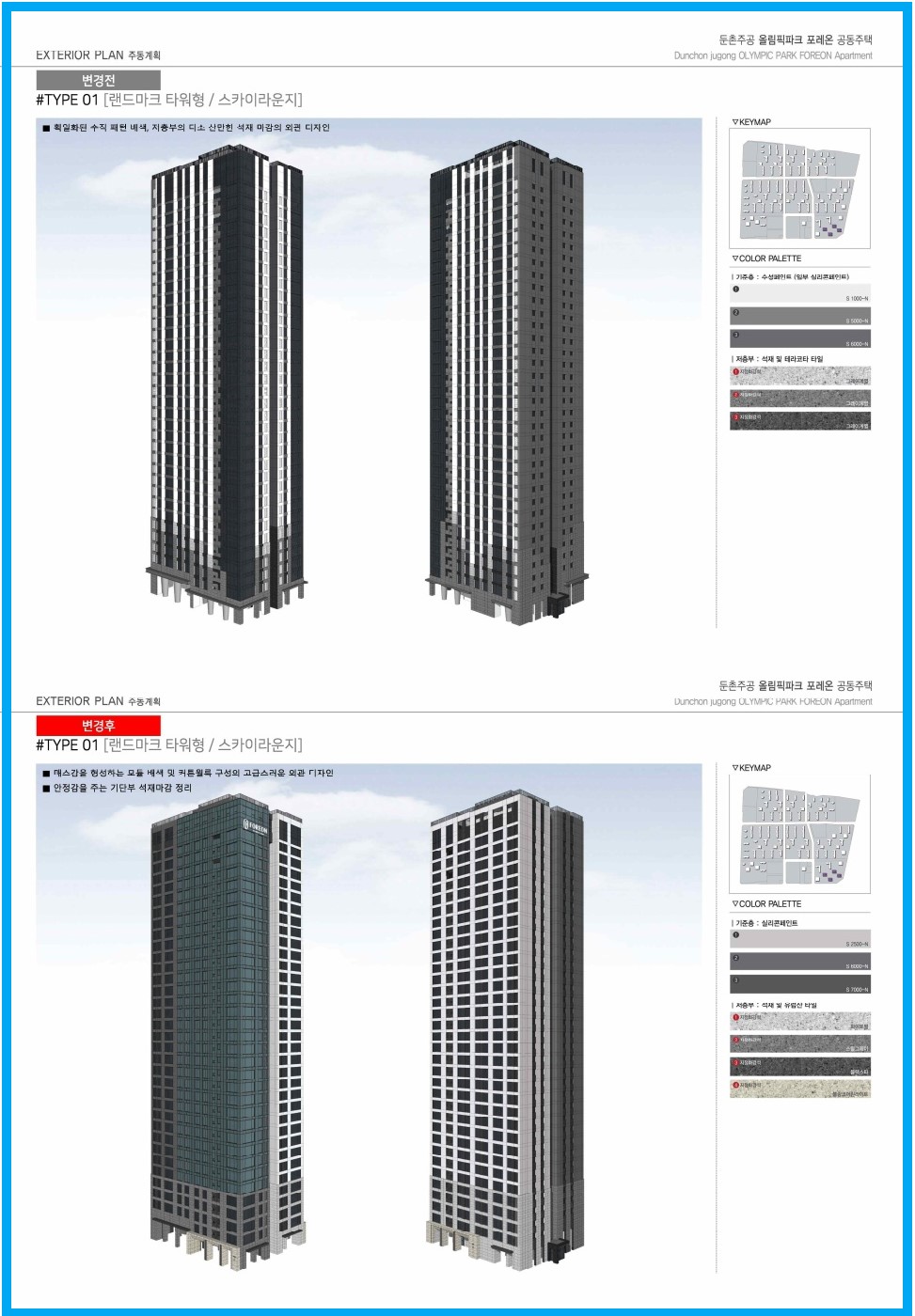 2023년 3월 4일에 진행 예정인 2023년 둔촌주공재건축 정기총회 안건 중 '외관 디자인 변경' 의결의 건과 관련 사항으로 조합원들께서는 총회 책자를 통해 자세히 살펴보실수 있겠지만 다시 한번 자료를 올려드립니다.