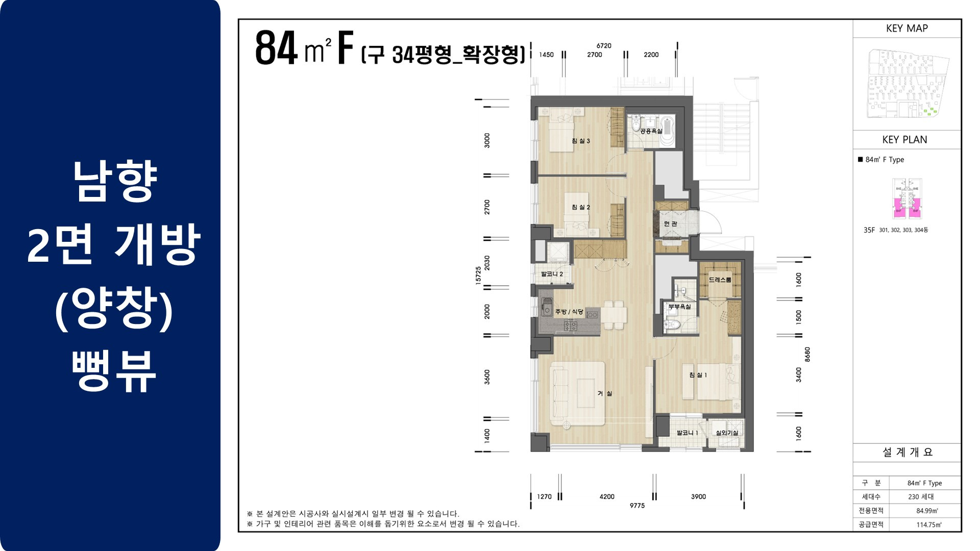 34평 중 F타입은 301동~304동 2,3라인에만 위치한 2면 개방 양창 구조로 개방감과 조망이 뛰어난 타입.