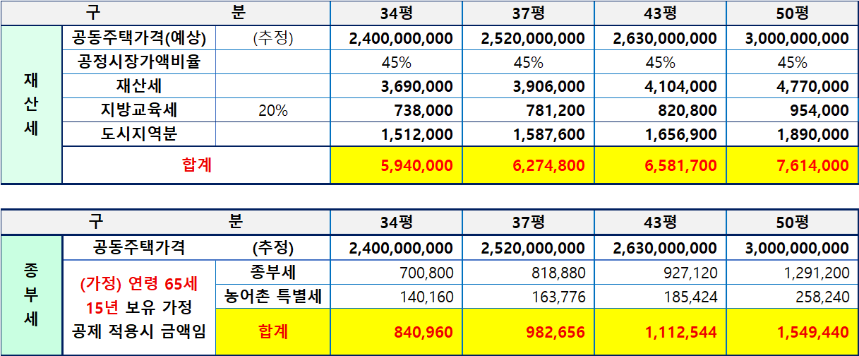위와 같은 가정을 기준으로 내년 재산세와 종부세가 어느 정도 되는지 추정해 보았습니다.