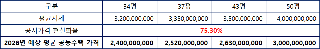 ※ 위 예상 공동주택 가격은 평형별 최고가 그룹에 속하는 가격 중 평균 가격 기준을 가정하여 계산.