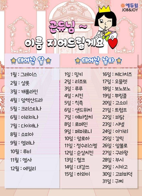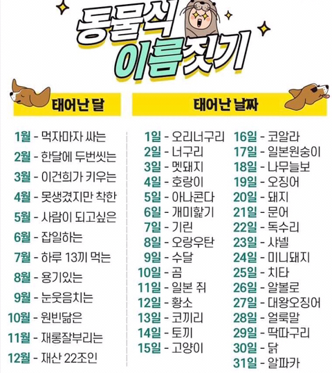 생일로 알아보는 이름짓기 작성자구티(특별회원)|작성시간19.08.05|조회수8,955 목록 댓글 13 글자크기 작게가 글자크기 크게가 재미로 보세요ㅋ먹자마자 싸는 얼룩말ㅎ 다음검색 현재 게시글 추가 기능 열기 북마크 공유하기 신고 센터로 신고 댓글 댓글 13 댓글쓰기 답글쓰기 댓글 리스트 삭제된 댓글입니다. 답댓글 작성자구티(특별회원) 작성자 본인 여부 작성자 | 작성시간 19.08.05 사람이 되고싶습니까?ㅋㅋ 작성자힐카매니저(카페장) | 작성시간 19.08.06 흠 못생기고 착한..ㅋ 작성자훈제구이 | 작성시간 24.11.26 눈웃음치는 닭... ㅋㅋ 답댓글 작성자구티(특별회원) 작성자 본인 여부 작성자 | 작성시간 24.11.26 불쌍하게도 곧 기름속으로..ㅎㅎ 댓글 전체보기