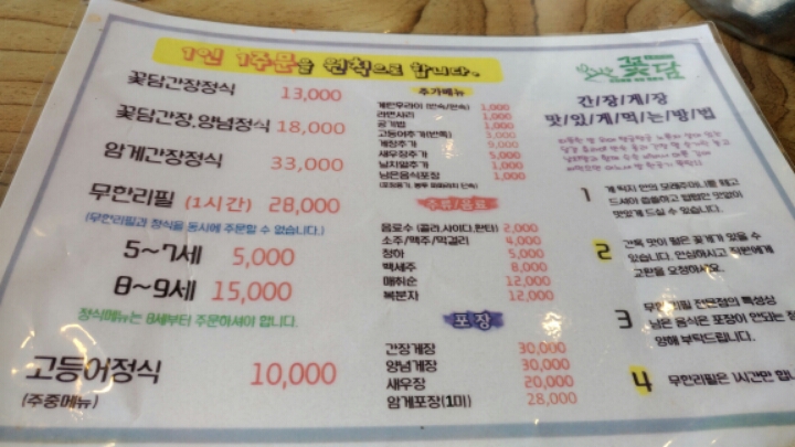- 가격대 : 꽃담간장정식 13,000원, 간장양념정식 18,000원, 암게간장정식 33,000원, 꽃게무한리필 28,000원