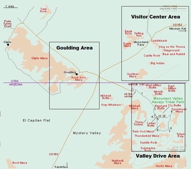 모뉴멘트밸리는Goulding지역, 방문자센터 인근지역, Valley Drive지역으로 크게 3곳의 지역으로