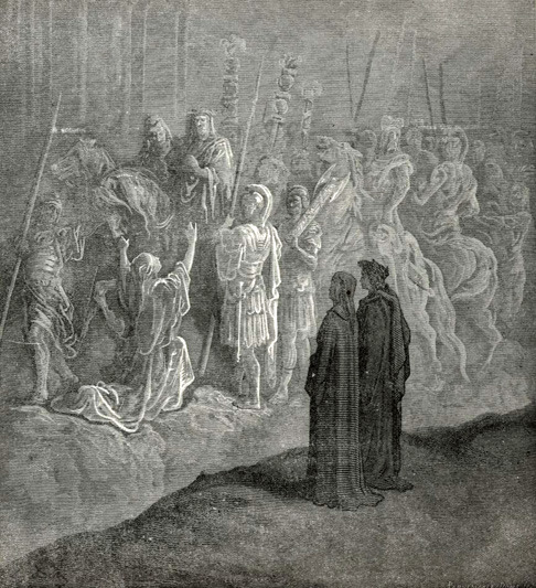 ☑ 만프레디는 나폴리와 시칠리의 왕이었으나 교회와 적대관계에 있다가 파문을 당하고 1266년 전사한다. 만프레디는 파문을 받고 죽은 자신이 지옥에 버림받은 줄로 세상 사람들이 알고 있거든 죽기 전에 회개하여 연옥에 있음을 딸에게 알려달라고 말한다.