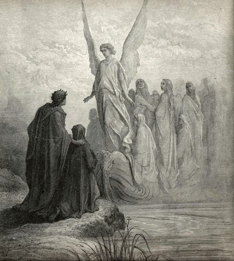☑ 지옥과는 달리 멀리 펼쳐진 풍경 속에서 뱃머리에 선 천사가 날갯짓을 하며 바다 위의 배를 미끄러지듯 움직인다. 베르길리우스는 단테에게 앞으로는 하느님의 사자(시종)로서 이러한 천사들을 만나게 될 것이라고 말한다.