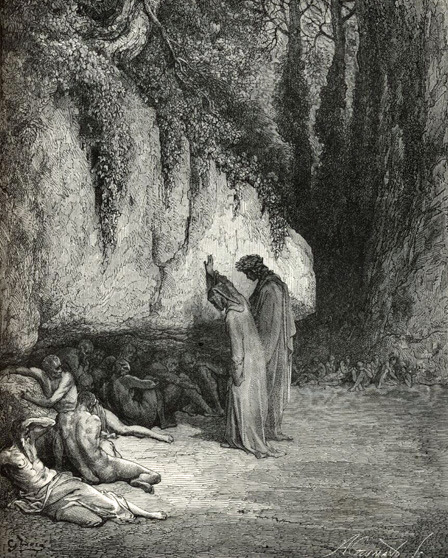 ☑ 영혼이 ‘새파랗게 질리다’는 글자 그대로는 ‘핏기를 잃었다’는 것이며, 경이와 불안을 느꼈다는 말이다. 그 이유는 죽은 자들의 영혼이 단테가 자기들과 달리 ‘숨을 쉬고 있다’는 것을 근거로 그가 살아 있음을 알아챘기 때문이다.