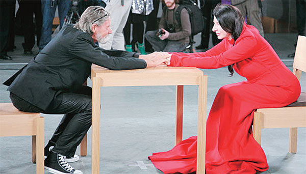 2층 로비에 올라가면 한쪽을 깨끗하게 정리해 놓고 테이블을 놓고 의자를 2개를 놓았습니다. 개관시간부터 아브라모비치가 그 자리에 앉아있으면 맞은편 테이블 빈 의자에 관람객 중에서 아무나 원하는 사람들이 원하는 시간만큼 아브라모비치의 얼굴을 정면으로 응시하면서 그냥 앉아 있는 거예요. 테이블을 사이에 놓고 마주보고 있는 겁니다. 무려 이 전시기간 동안에 하루도 예외 없이 아브라모비치가 앉아서 관람객들과 마주보고 있었는데 736시간 30분 동안 앉아 있었고, 그러는 동안에 맞은편 의자에 1400명의 관람객이 참가를 해서 작가와 함께 마주보기를 했다는 거예요. 그게 작품입니다. 작가와 마주보는 것이 행위예술 작품인 거예요.