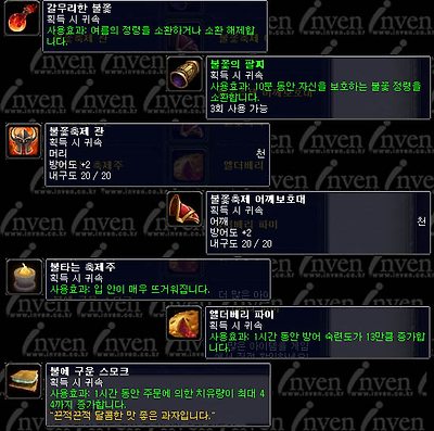');" [안내]태그제한으로등록되지않습니다-xxonmouseout=bbsLayerHide();>불꽃의 팔찌, | 불타는 꽃 | | 사용효과: 불꽃 축제 화톳불에 던져 넣습니다. |