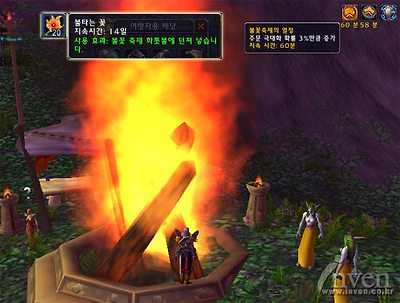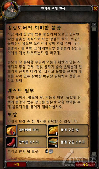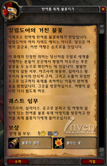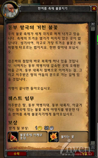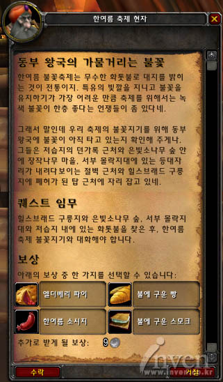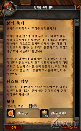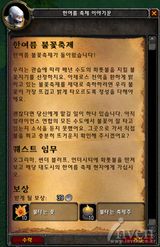 시작 NPC : 각 대도시의 NPC '한여름축제 현자' 퀘스트 레벨 : 60 진영 구분 : 얼라이언스 보상 아이템 : | 불타는 꽃 | | 사용효과: 불꽃 축제 화톳불에 던져 넣습니다. |