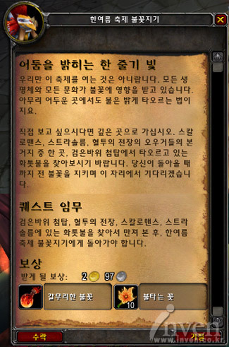 시작 NPC : 각 대도시의 NPC '한여름축제 이야기꾼' 퀘스트 레벨 : 60 진영 구분 : 호드 보상 아이템 : | 불타는 꽃 | | 사용효과: 불꽃 축제 화톳불에 던져 넣습니다. |