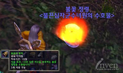 시작 NPC : 각 대도시의 NPC '한여름축제 불꽃지기' 퀘스트 레벨 : 60 진영 구분 : 중립 보상 아이템 : | 불꽃의 팔찌 | | 획득시귀속 | | 사용효과: 10분 동안 자신을 보호하는 불꽃 정령을 소환합니다. |