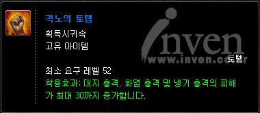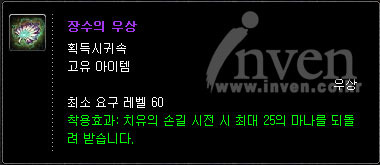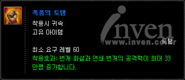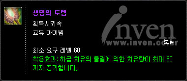 토템 레벨 제한 : 60 착용효과 : 하급 치유의 물결을 시전할때마다 10의 마나를 획득합니다.