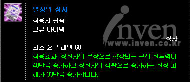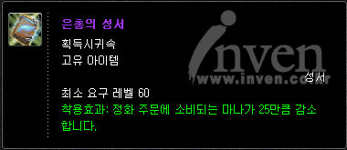 1.11패치에 추가된 성물로 50레벨 이상 지역(운고로분화구 이상)의 몬스터에게서 얻다. 특이하게 다른 직업과 다르게 이 성물은 획득시 귀속이다.