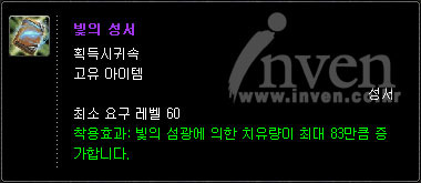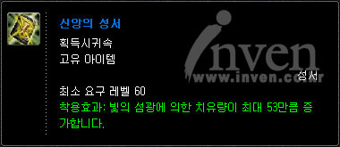 빛의섬광의 치유량을 최대 83만큼이나 늘려주는 신상의 성서의 업그레이드판 빛의섬광의 치유량을 늘려주는 빛의심판의 치유량 증가가 115임을 감안해보면 엄청난 물건임에는 틀림이 없다.