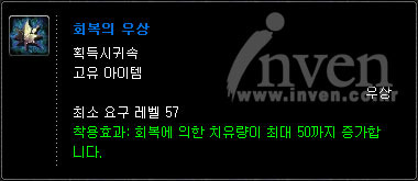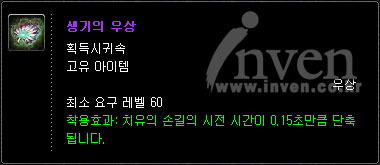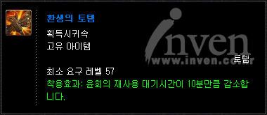 57레벨 성물임에도 불구하고 있는지 없는지 의미를 부여하기 힘든 성물. 윤회 재사용대기시간 10분감소는 물론 특성포인트 1포인트나 소비하는 특성이긴 하지만 전멸을 할 바에는 한대라도 더치거나 한번이라도 더 힐링을 하는게 좋을 듯.