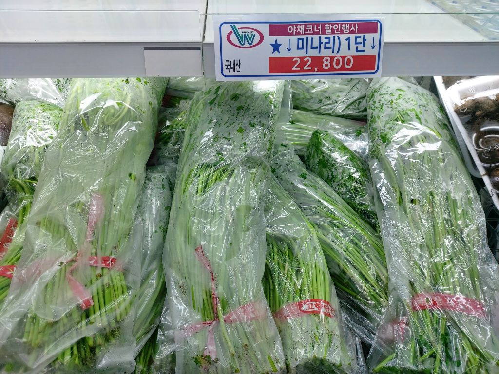 시금치는 아예 진열조차 안되있고 나박김치에 넣을 미나리는 1단에 22,800원 가격이 붙어 있어서 직원에게 맞는 가격이냐고 물으니 맞다고 합니다.