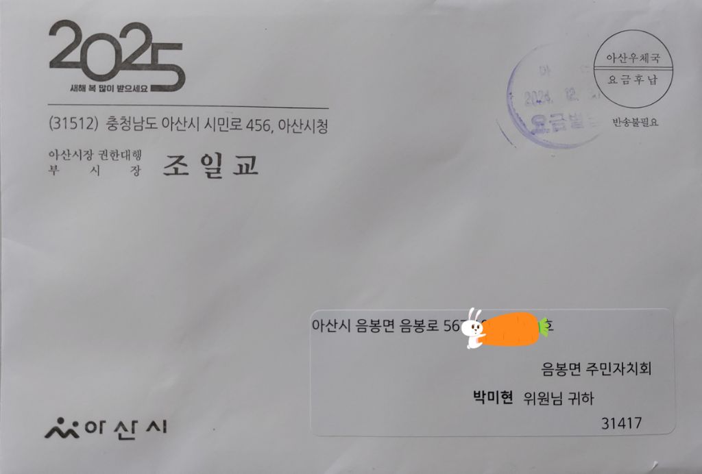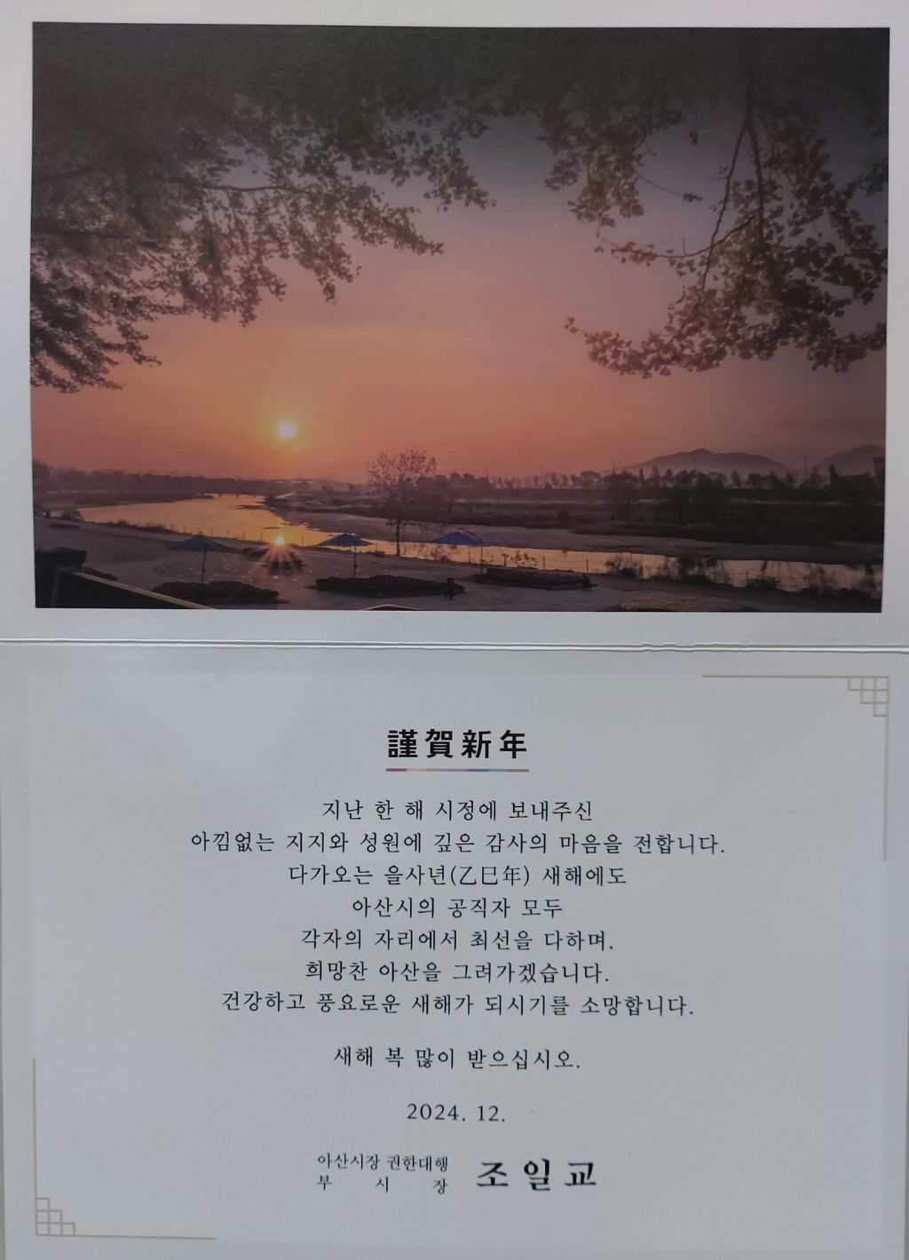 가수박미현 온양블루스-을사년 2025 새해 복 많이 받으세요 아산시장 권한대행 부시장 조일교 신년 연하장 우편으로 도착 작성자가수박미현(온양블루스)|작성시간25.01.09|조회수73 목록 댓글 0 글자크기 작게가 글자크기 크게가 을사년 2025 새해 복 많이 받으세요 아산시장 권한대행 부시장 조일교 신년 연하장 우편으로 도착 다음검색 현재 게시글 추가 기능 열기 북마크 공유하기 신고 센터로 신고 댓글 댓글 0 댓글쓰기 답글쓰기 댓글 리스트