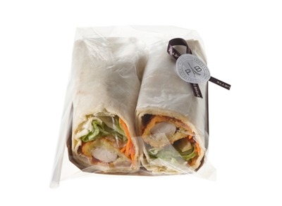 또띠아롤을 전자렌지에 10초간 가열 → 스위트머스타드소스 10g→ 깻잎2장→튀킨 치킨커틀릿 2조각→