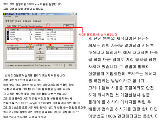 [[정보]]디아블로2 멀티로더 사용법 작성자후니공주|작성시간10.04.13|조회수1,843 목록 댓글 0 글자크기 작게가 글자크기 크게가 전에 만들어 놓았던 그림 설명서인데 그냥 올리니 크기 때문에 줄어드네요 클릭해서 따로 보세요 ^^ ※ 시디키 생성 파일은 디아블로 실행중엔 실행되지 않습니다 ※ 오른쪽 시디키생성 파일은 반드시 다운받으신후 뒤에 붙은 제 아이디 '-moo0506'부분은 삭제하시고 실행하세요 [출처] 디아블로2 멀티로더 사용법 !!!| 다음검색 현재 게시글 추가 기능 열기 북마크 공유하기 신고 센터로 신고 댓글 댓글 0 댓글쓰기 답글쓰기 댓글 리스트