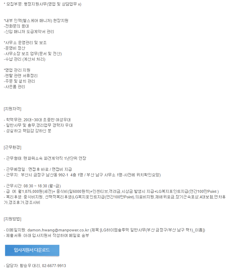 [부산]맨파워코리아 [부산 2명/중식비] LG하이엠솔루텍 사무직 채용(복지포인트/소속전환)(상시모집) 작성자홍혜윤|작성시간17.07.10|조회수17 목록 댓글 0 글자크기 작게가 글자크기 크게가 [채용정보 바로가기] 다음검색 현재 게시글 추가 기능 열기 북마크 공유하기 신고 센터로 신고 댓글 댓글 0 댓글쓰기 답글쓰기 댓글 리스트