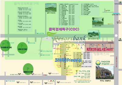 1) 클락프리존지역내 ( CDC내 ) : 일명 클락공항내 미모사 공군기지가 있던곳입니다. 장점 : 보안이 철저하고 잡상인들도 없고 굴직굴직한 호텔들이 있으며 더럽지 않음.깔끔하고 하나의 단점 : 걸어서 이동은 거의 불가능함.카페나 술집이 없음.한국식당과 일식집.사우나등은 있습니다. 남자들끼리 간다면 당연히 못있죠 ..CDC밖으로 나가겠죠.심심해서.. ☞ 호텔리스트 ⊙ 스토젠베르크호텔 (특급호텔) : 카지노가 있음 ⊙ 홀리데이인호텔 (준특급호텔) : 개보수로 깔끔해졌음 ⊙ 몬테비스타빌라 (단독빌라) : 일명 다들 어렴풋이 알고 계신 빌라임.2인실.4인실이 있으며 ⊙ 폰타나리조트 (단독빌라) : 몬테비스타보다 조금 수준이 떨어짐.미군기지 사병들의 숙소였음 구조는 몬테비스타와 동일함. ⊙ 옥스포드호텔 (준특급호텔) : 로비가 운동장같은 곳으로 조금 썰렁하기도 함. ⊙ 아시아나그린빌 (준특급정도) : 한국인이 주인이며 2층구조로 몇개의 동으로 이루어짐 객실나름깔끔하고 1동에 4실.2실로 이루어져 있고 작은수영장이 있으며 조식이 한식으로 준비됨. ⊙ 뉴웰빙스파 (특급정도) : 한국인이 주인이며 최근에 지어진거라 나름대로 야심차게 지었음 사우나시설좋고 수영장좋고 객실 또한 이정도면 훌륭함.식사 또한 깔끔하게 나옴