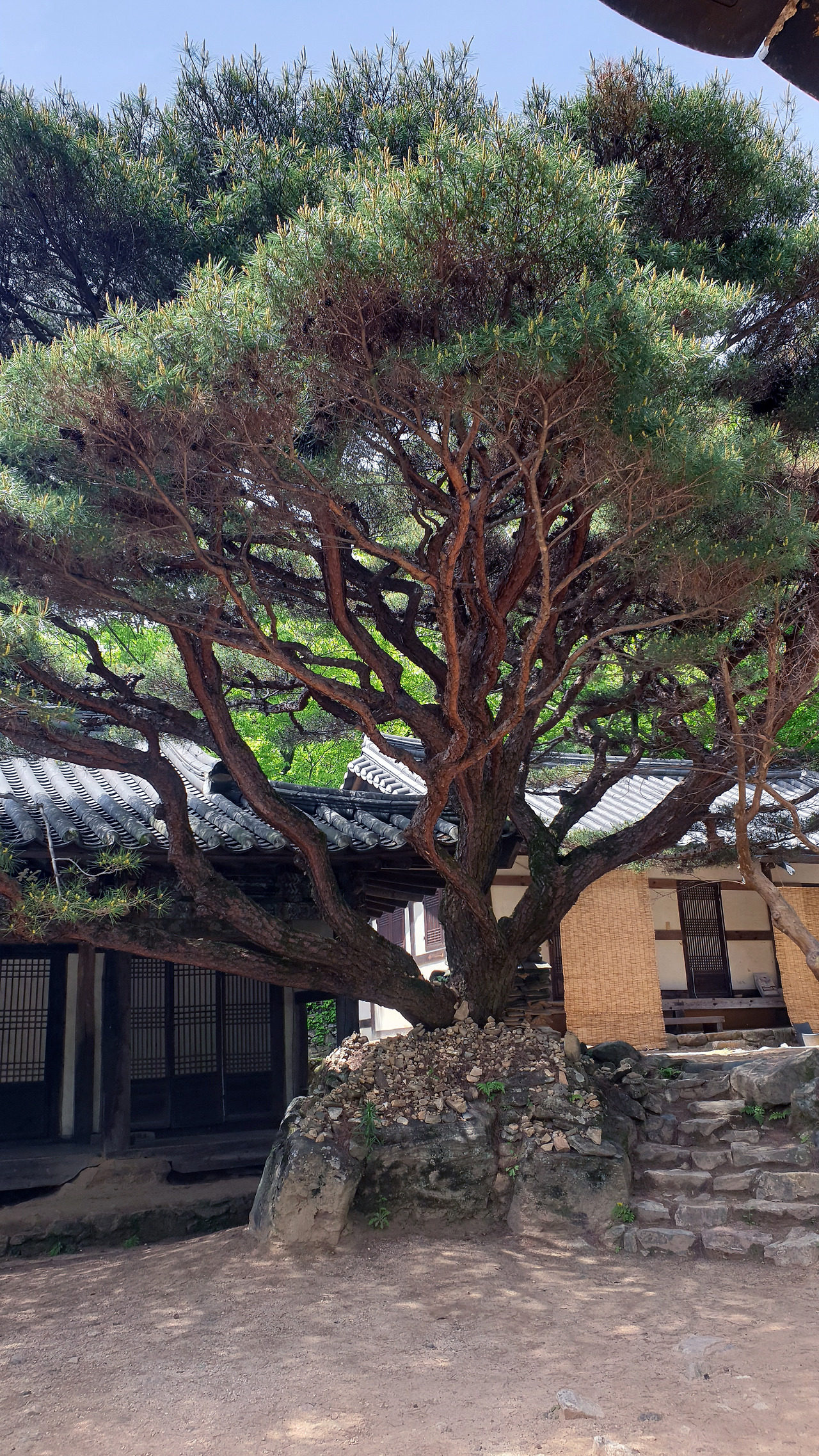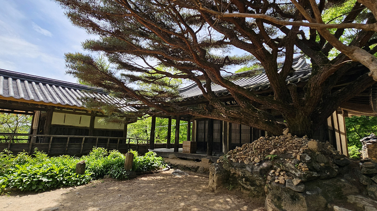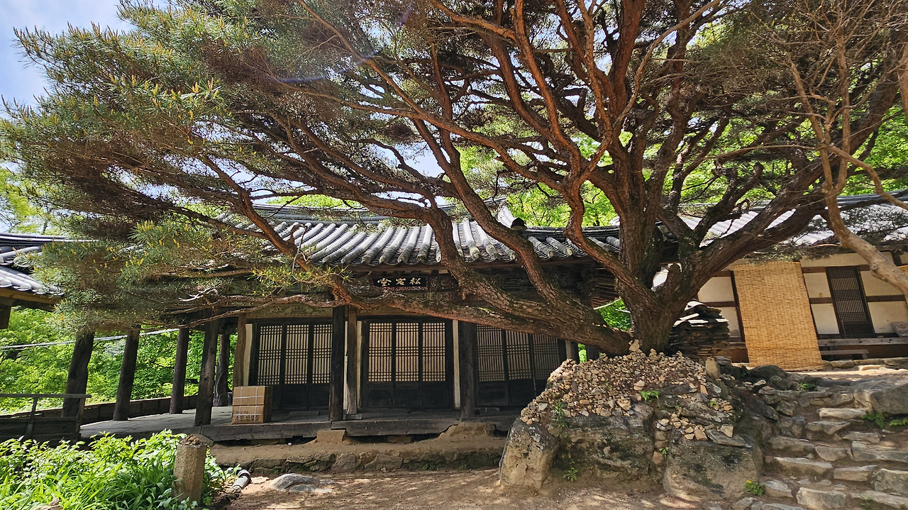 송암당 앞에 우람하고 둥글게 뻗은 보호수 소나무가
