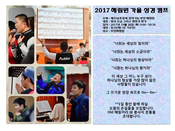 2017년 가을성경캠프 자원봉사자 공연팀 모집합니다. 작성자이희철|작성시간17.09.27|조회수18 목록 댓글 0 글자크기 작게가 글자크기 크게가 주님의 은혜가운데 준비기간 부터 마치는 시간까지잘 진행되기 위해 기도 바랍니다. 다음검색 현재 게시글 추가 기능 열기 북마크 공유하기 신고 센터로 신고 댓글 댓글 0 댓글쓰기 답글쓰기 댓글 리스트