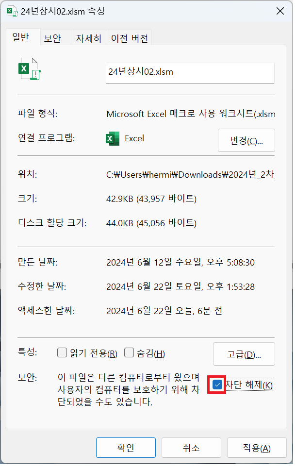 파일 탐색기에서 해당 파일(ex> 2024년A형소스.xlsm)을 찾아 마우스 오른쪽 버튼 → 속성 → 차단 해제 체크