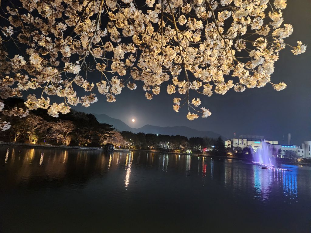 그 분과 헤어 지면서 오늘따라 유난히도 예쁜 밤벚꽃과 그 사이로 보이는 보름달 그리고 호수에서 흘러 나오는 음악분수는 정말 장관 이었습니다ㆍ