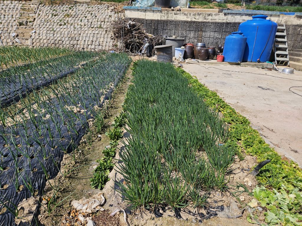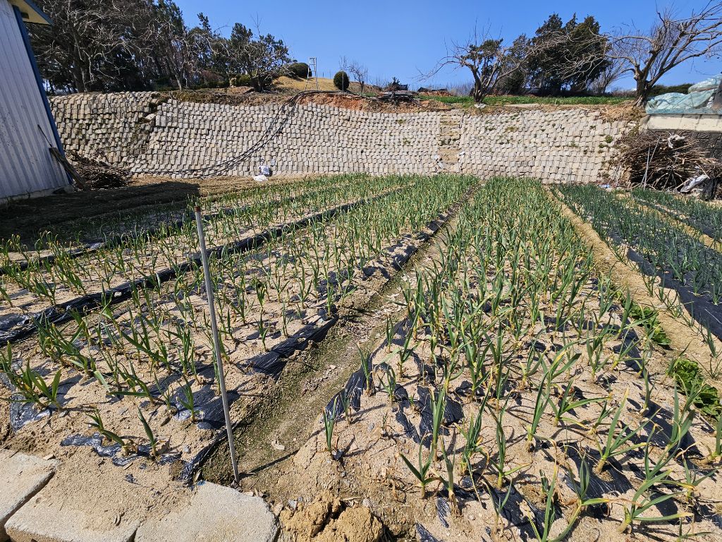마당한켠에 자리잡은 아버지 엄마의 텃밭에선 마늘과