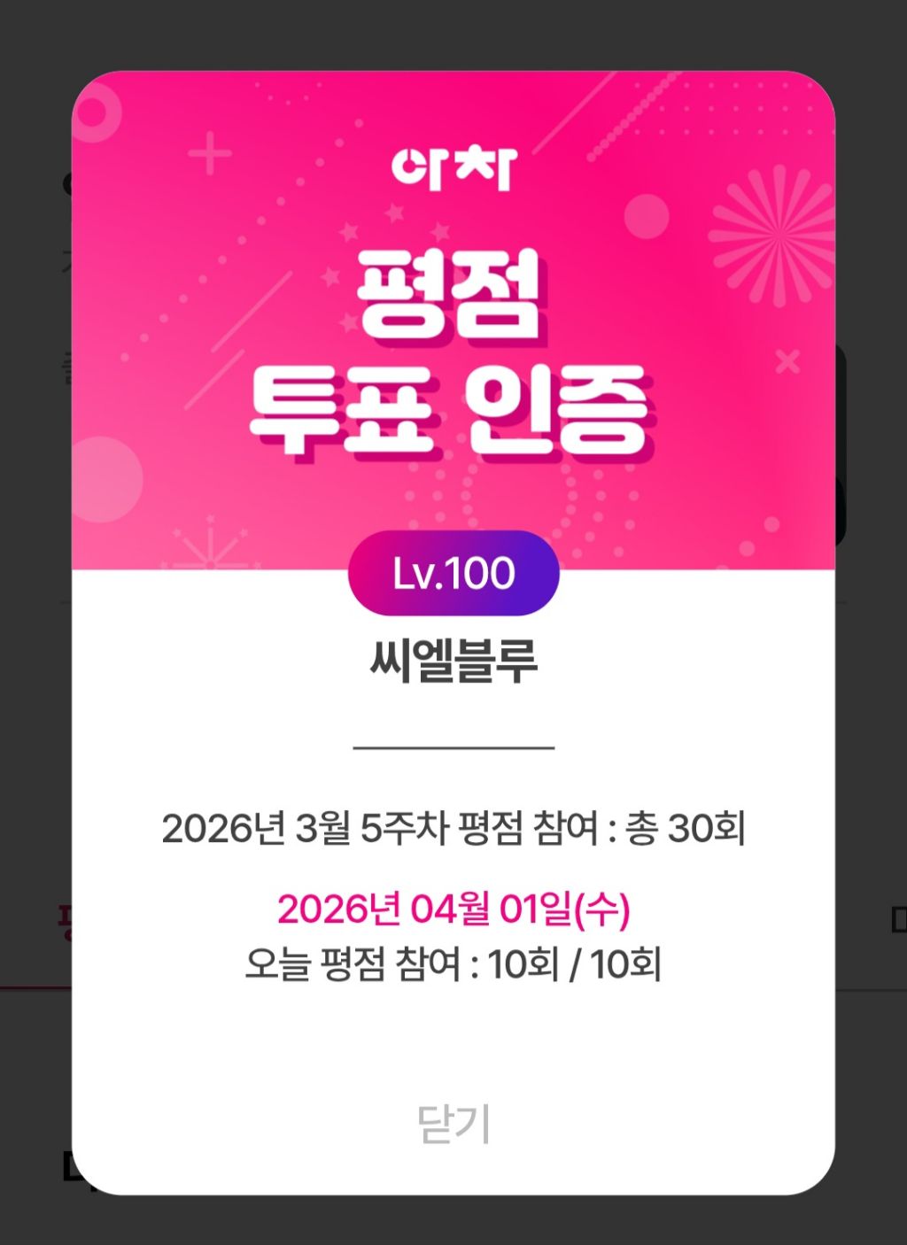 아이돌차트 함께 해요💕💕💕 작성자씨엘블루(성남)|작성시간26.04.01|조회수93 목록 댓글 36 글자크기 작게가 글자크기 크게가 웅모닝입니다평점주기엄지척 클릭하여 숫자변동 확인게시판 공감하기 함께 해요웅사랑으로모든 응원 함께 하며해피 응데이 되세요♡♡♡♡♡ 다음검색 현재 게시글 추가 기능 열기 북마크 신고 센터로 신고 댓글 댓글 36 댓글쓰기 답글쓰기 댓글 리스트 작성자땔기에이꼬(서울) | 작성시간 26.04.01 이미지 확대 작성자수채화(울산) | 작성시간 26.04.01 이미지 확대 작성자처진궁디(인천) | 작성시간 26.04.01 이미지 확대 작성자지니맘(수원) | 작성시간 26.04.01 이미지 확대 작성자진이잉잉 (서울) | 작성시간 26.04.01 이미지 확대 댓글 전체보기