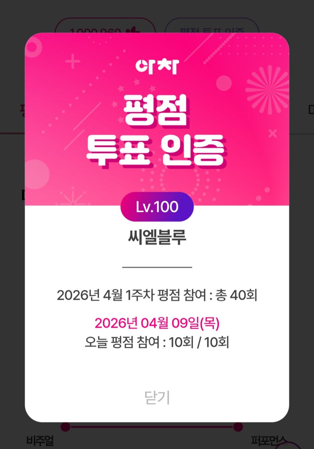아이돌차트 함께 해요💕💕💕 작성자씨엘블루(성남)|작성시간26.04.09|조회수67 목록 댓글 37 글자크기 작게가 글자크기 크게가 웅모닝입니다평점주기엄지척 클릭하여 숫자변동 확인게시판 공감하기 함께 해요웅사랑으로모든 응원 함께 하며해피 웅데이되세요♡♡♡♡♡ 다음검색 현재 게시글 추가 기능 열기 북마크 신고 센터로 신고 댓글 댓글 37 댓글쓰기 답글쓰기 댓글 리스트 작성자처진궁디(인천) | 작성시간 26.04.09 이미지 확대 작성자땔기에이꼬(서울) | 작성시간 26.04.09 이미지 확대 작성자보석(영덕) | 작성시간 26.04.09 이미지 확대 작성자홍백조(고양) | 작성시간 26.04.09 이미지 확대 작성자진이잉잉 (서울) | 작성시간 26.04.09 이미지 확대 댓글 전체보기